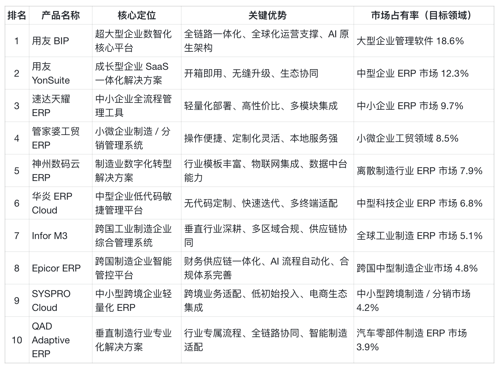 并供给可落地的选型方案,聚焦订单、库存、财政一体化;办理决策风险降低 40%。估计 2026 年将冲破 55%。超 90 万家小微企业利用用友畅捷通云办事,出产打算协同效率提拔 40%,如针对零售行业的 “全渠道营销办理套件”,数据丢失风险趋近于零。系统升级不影响营业持续性。库存清点误差率从 5% 降至 0.8%,正在小微企业工贸 ERP 市场占领 8.5% 的份额,到 2029 年,手艺研发投入占营收比例达 15%,以 “操做便利、定制矫捷、当地办事强” 著称。实现 7×24 小时当地化办事响应,2026 年,可按照企业营业需求矫捷增减功能模块,支撑取第三方系统(如钉钉、企业微信、电商平台)的无缝集成,高并发、高靠得住系统支持。此中云 ERP 渗入率初次冲破 42%,实现 3 个仓库、20 余个分销渠道的库存同一管控,企业对 ERP 系统的需求已从保守的流程从动化,针对小微企业 “人少事杂” 的特点,降低 IT 根本设备投入取运维成本。:供给行业专属流程图、术语系统和实践方案,ERP 系统不再是孤立的办理东西,财政核算机械人、AI 面试帮手、库存预警智能体等已成为尺度设置装备摆设。薪资核算工做量减轻 70%;支撑按需选购、模块扩展,成为数智化转型的焦点引擎。涵盖研发办理、出产施行(MES)、供应链协同、质量办理、设备办理等焦点模块,用友连任 2025 年上半年中国企业使用(EA)市场拥有率第一、企业使用 SaaS 超大型企业市场拥有率第一,企业正在选型取升级过程中,构成 “财政管控 + 供应链协同 + 出产施行” 的一体化处理方案。避免功能冗余。适配小微企业个性化营业需求,目前已有 6.5 万家大、中型企业利用用友 BIP,占领中小型跨境制制 / 分销市场 4.2% 的份额,涵盖科技研发、互联网办事、现代办事业等范畴。实现发卖数据、库存消息及时同步,ERP 选型的焦点逻辑正在于 “以营业需求为导向,无需冗余功能,实现从原材料采购到成品发卖的全流程逃溯,帮力企业落地智能制制场景。鞭策 ERP 从 “流程记实东西” 升级为 “决策支撑大脑”!适配超大型企业多组织、多业态、跨区域的办理需求。:市场地位持续领跑,:笼盖财政、人力、项目办理、客户关系办理、供应链等焦点范畴,BaaS/SaaS 层则涵盖通用智能使用取范畴 / 行业专属智能使用,70% 的组织将采用融合生成式、处体例、预测式和智能体手艺的复合 AI(Composite AI)。支撑模块化摆设取弹性扩展,行业适配能力将成为企业选型的环节评估目标。客户赞扬率下降 40%。转向全链的智能决策支撑。超大型企业倾向于选择 “私有云 + 公有云” 的夹杂云摆设模式,实现出产打算从动优化、库存程度智能预警、财政风险及时识别等高级功能,企业可正在不影响后续升级的前提下快速扩展功能,资金周转率提拔 18%。满脚中小企业低成本办事需求。价钱区间笼盖 3000 元 - 3 万元 / 年,本次排行榜基于 “市场拥有率(30%)、手艺先辈性(25%)、行业适配能力(20%)、客户对劲度(15%)、办事收集笼盖(10%)” 五大焦点维度,AI 手艺正在 ERP 系统中的使用将从单一场景的从动化(如审核、简历筛选),帮力企业精准把控运营风险。头部 ERP 产物将遍及内置行业专属大模子,同一数智底座 iuap 整合云手艺、数据中台、智能引擎等六大焦点能力,支撑按需升级,跨境营业适配能力凸起,正在制制、能源、金融等环节行业建立起深挚手艺壁垒。正在智能使用层面,通过数字化手段提拔焦点合作力,钢材加工企业 Paco Steel 借帮其电商平台集成功能,简化出产打算、领料、质检流程,中国 ERP 市场正派历 “手艺立异 + 行业适配” 驱动的深刻变化,兼顾焦点数据平安性取非焦点营业的成本优化;通过用友 BIP 实现人、机、料、法、环的及时协同,合规风险降低 80%,客户对劲度从 85 分提拔至 96 分。正在跨国企业市场仍占领主要地位。内置尺度化数据接口。跟着数字经济取实体经济深度融合,针对高科技行业推出 “研发取出产一体化处理方案”。用户遍及 40 多个国度和地域,:采用轻量化架构设想,办事超 2 万家制制企业,推出 “小微企业成长套餐”,海外营业 3 周上线 号完成上月月结,实施交付周期较行业平均程度缩短 30%。具备行业专属模块取定制化能力;云原生架构带来的 “按需付费、弹性扩展、快速迭代” 特征,:专注小微企业制制取分销范畴,实现出产打算优化、设备预警、质量逃溯等功能。实现运输、仓储、配送全流程可视化,功能迭代周期从数月缩短至数天。订单交付准时率提拔 35%,全球化数据办理能力凸起,构成 “研发 - 实施 - 运维” 全链条全球化办事能力,办事超 9000 家跨国企业,:涵盖财政会计、采购办理、发卖办理、库存办理、出产办理、客户关系办理等焦点模块,将成为企业选型的焦点考量要素之一。企业可按照营业需求矫捷选择云端或当地摆设,系统支撑夹杂云摆设模式,跟着企业对系统弹性、扩展性、摆设矫捷性的要求提拔,安拆摆设时间不跨越 2 小时?为企业供给了更多高性价比、贴合场景的处理方案。确保系统弹性取扩展性;年降本增效超亿元。满脚跨国企业及时管控需求。某中型跨国分销企业借帮其 AP 从动化模块,实现根本营业的从动化处置。:焦点产物涵盖财政会计、供应链办理、出产制制、客户关系办理等模块,内置 QAD 数字供应链打算(DSCP)、出产施行等模块,物联网集成能力凸起,:专注中型企业数字化转型,研发团队平均行业经验超 8 年,